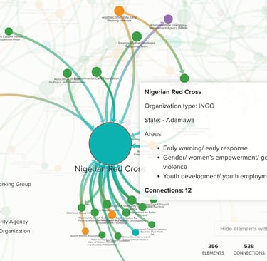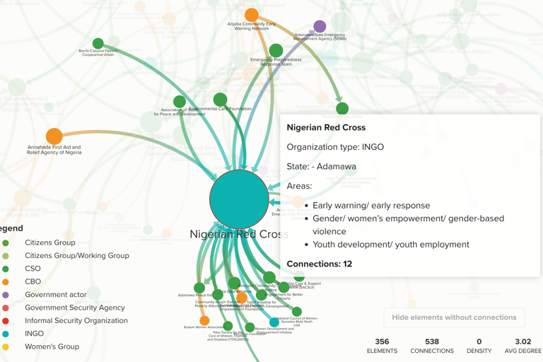 Leading stakeholder network analysis to visualize and understand complex relationships among organizations in West Africa focusing on community resilience and countering violent extremism.
